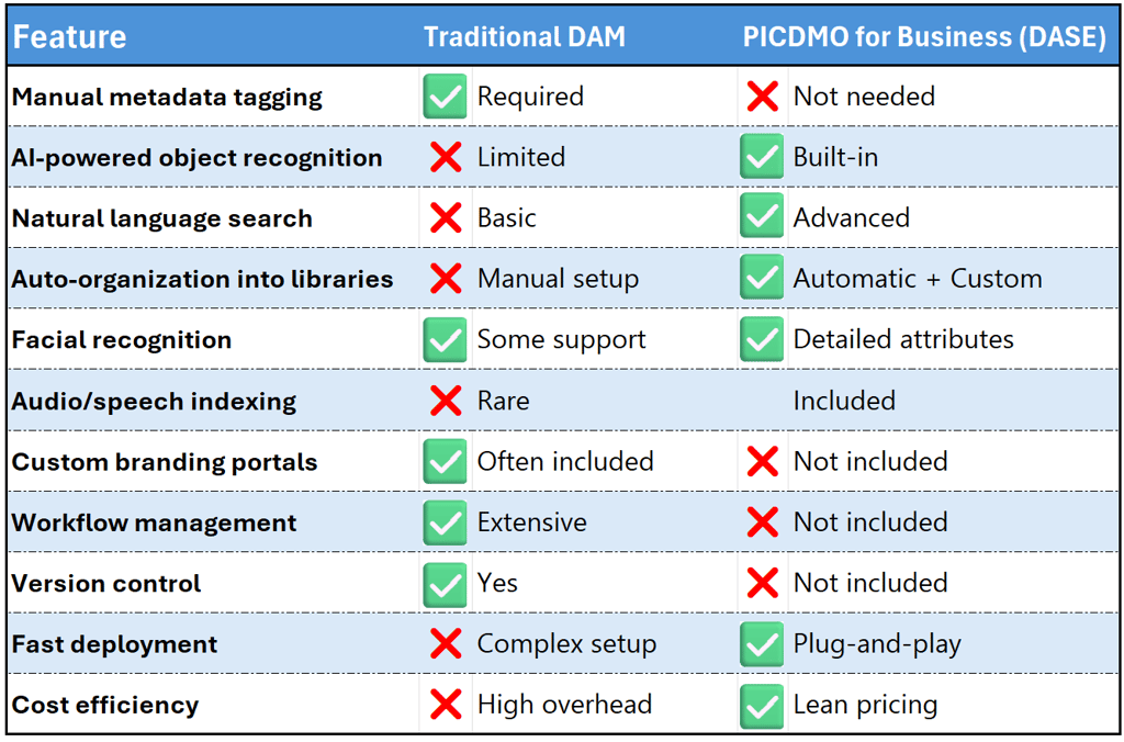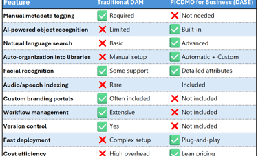 PICDMO for Business is a Digital Asset Search Engine (DASE) — Built for instant, intelligent access to your media library without the overhead and costs of a traditional Digital Asset Management system (DAM). For those that need the additional functionality provided by a Digital Asset Management System we can integrate with yours!